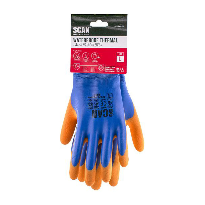 Scan Thermal Waterproof Latex Grip Gloves - Blue/Orange Size 9 (L)